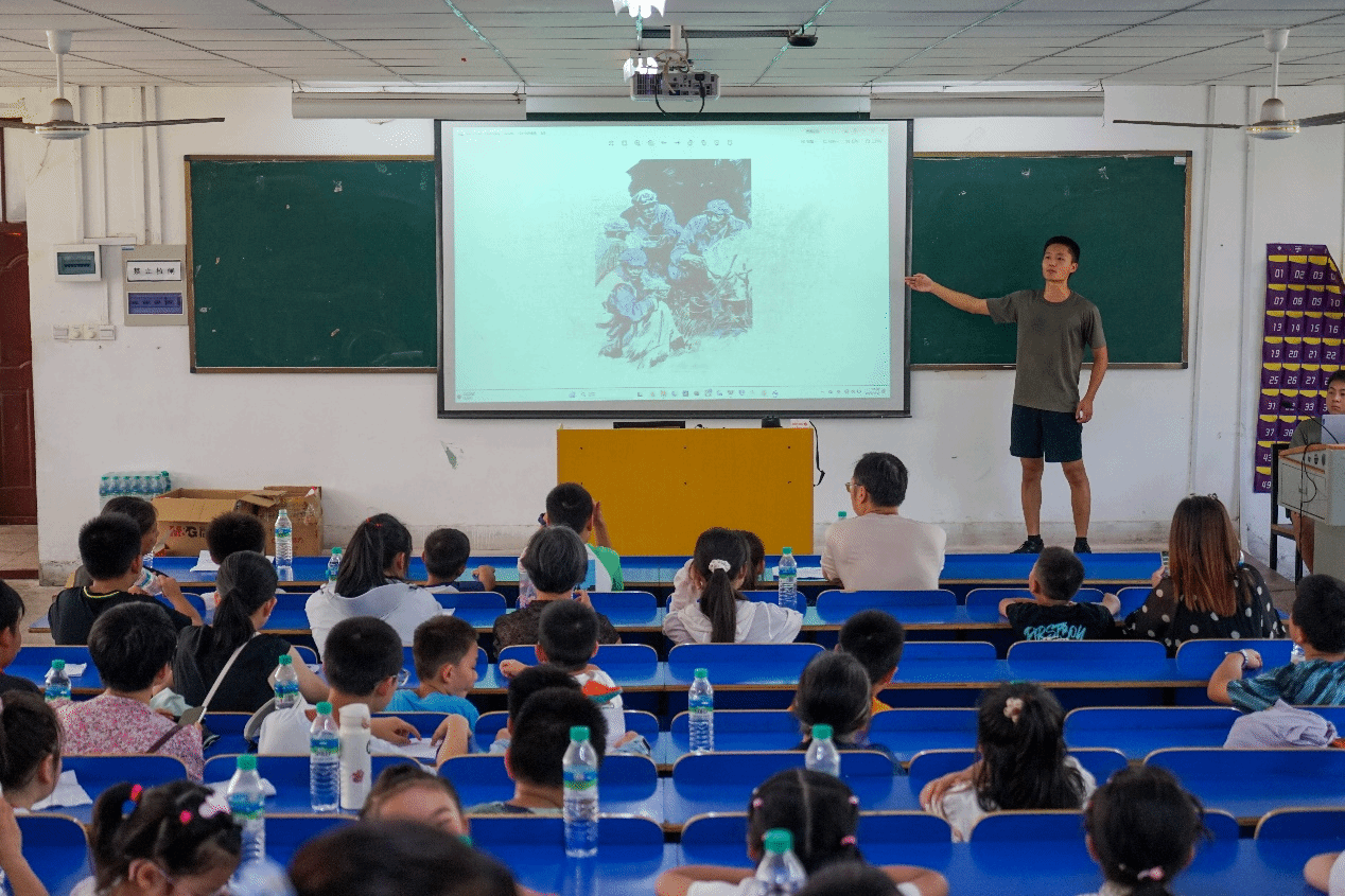 在军教楼110教室,军士生代表用生动活泼的语言,为小朋友们讲述了长征故事和英雄事迹,引导他们感悟革命先辈的战斗精神。在国防知识问答环节,小朋友们积极思考、踊跃举手,在互动中加深了对国防知识的理解。